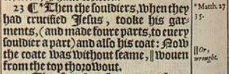 23 ¶ *Then the souldiers, when they had crucified Iesus, tooke his garments, (and made foure parts, to euery souldier a part) and also his coat: Now the coate was without seame, || wouen from the top thorowout.[*Matth.27 35. , ||Or, wrought.]