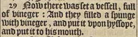 29 Now there was set a vessell, full of vineger: And they filled a spunge with vineger, and put it vpon hyssope, and put it to his mouth.