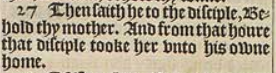 27 Then saith he to the disciple, Behold thy mother. And from that houre that disciple tooke her vnto his owne home.