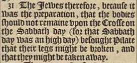 31 The Iewes therefore, because it was the preparation, that the bodies should not remaine vpon the Crosse on the Sabbath day (for that Sabbath day was an high day) besought Pilate that their legs might be broken, and that they might be taken away.