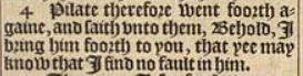4 Pilate therefore went foorth againe, and saith vnto them, Behold, I bring him foorth to you, that yee may know that I find no fault in him.