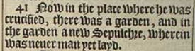 41 Now in the place where he was crucified, there was a garden, and in the garden a new Sepulchre, wherein was neuer man yet layd.