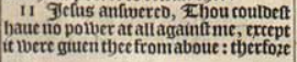11 Iesus answered, Thou couldest haue no power at all against me, except it were giuen thee from aboue: therfore he that deliuered me vnto thee, hath the greater sinne.