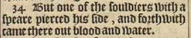 34 But one of the souldiers with a speare pierced his side, and forthwith came there out blood and water.