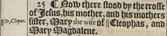 25 ¶ Now there stood by the crosse of Iesus, his mother, and his mothers sister, Mary the wife of ||Cleophas, and Mary Magdalene.[||Or, Clopas.]