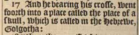 17 And he bearing his crosse, went foorth into a place called the place of a skull, which is called in the Hebrewe, Golgotha: