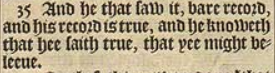 35 And he that saw it, bare record, and his record is true, and he knoweth that hee saith true, that yee might beleeue.