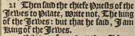 21 Then said the chiefe Priests of the Iewes to Pilate, Write not, The king of the Iewes: but that he said, I am King of the Iewes.