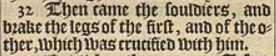 32 Then came the souldiers, and brake the legs of the first, and of the other, which was crucified with him.