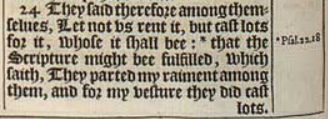 24 They said therefore among themselues, Let not vs rent it, but cast lots for it, whose it shall bee: *that the Scripture might bee fulfilled, which saith, They parted my raiment among them, and for my vesture they did cast lots. These things therefore the souldiers did.[*Psal. 22.18]