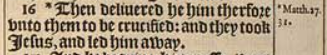 16 *Then deliuered he him therfore vnto them to be crucified: and they took Iesus, and led him away.[*Matth.27.31.]