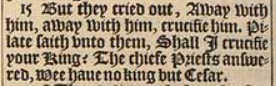 15 But they cried out, Away with him, away with him, crucifie him. Pilate saith vnto them, Shall I crucifie your King? The chiefe Priests answered, Wee haue no king but Cesar.