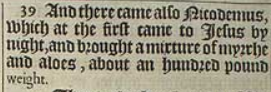 39 And there came also Nicodemus, which at the first came to Iesus by night, and brought a mixture of myrrhe and aloes, about an hundred pound weight.