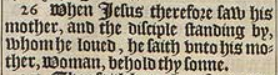 26 When Iesus therefore saw his mother, and the disciple standing by, whom he loued, he saith vnto his mother, Woman, behold thy sonne.