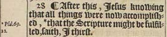 28 ¶ After this, Iesus knowing that all things were now accomplished, *that the Scripture might be fulfilled, saith, I thirst.[*Psal.69.12.]