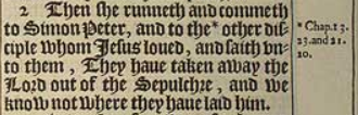 2 Then she runneth and commeth to Simon Peter, and to the *other disciple whom Iesus loued, and saith vnto them, They haue taken away the Lord out of the Sepulchre, and we know not where they haue laid him.[*Chap.13.23.and 21.20.]