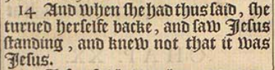 14 And when she had thus said, she turned herselfe backe, and saw Iesus standing, and knew not that it was Iesus.