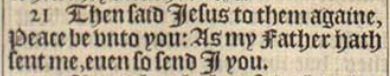 21 Then said Iesus to them againe, Peace be vnto you: As my Father hath sent me, euen so send I you.