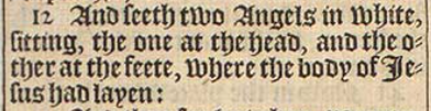 12 And seeth two Angels in white, sitting, the one at the head, and the other at the feete, where the body of Iesus had layen: