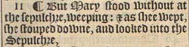 11 ¶ But Mary stood without at the sepulchre, weeping: & as shee wept, she stouped downe, and looked into the Sepulchre,