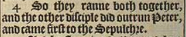 4 So they ranne both together, and the other disciple did outrun Peter, and came first to the Sepulchre.
