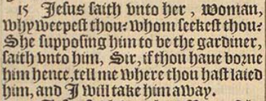 15 Iesus saith vnto her, Woman, why weepest thou? whom seekest thou? She supposing him to be the gardiner, saith vnto him, Sir, if thou haue borne him hence, tell me where thou hast laied him, and I will take him away.