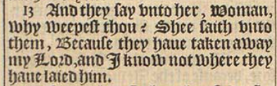 13 And they say vnto her, Woman, why weepest thou? Shee saith vnto them, Because they haue taken away my Lord, and I know not where they haue laied him.