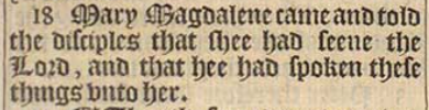 18 Mary Magdalene came and told the disciples that shee had seene the Lord, and that hee had spoken these things vnto her.