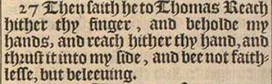 27 Then saith he to Thomas Reach hither thy finger, and beholde my hands, and reach hither thy hand, and thrust it into my side, and bee not faithlesse, but beleeuing.