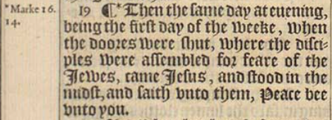 19 ¶ *Then the same day at euening, being the first day of the weeke, when the doores were shut, where the disciples were assembled for feare of the Iewes, came Iesus, and stood in the midst, and saith vnto them, Peace bee vnto you.[*Marke 16.14.]