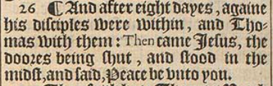 26 ¶ And after eight dayes, againe his disciples were within, and Thomas with them: Then came Iesus, the doores being shut, and stood in the midst, and said, Peace be vnto you.