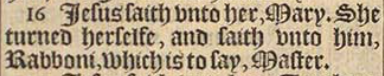 16 Iesus saith vnto her, Mary. She turned herselfe, and saith vnto him, Rabboni, which is to say, Master.