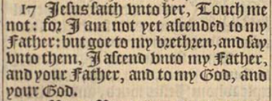 17 Iesus saith vnto her, Touch me not: for I am not yet ascended to my Father: but goe to my brethren, and say vnto them, I ascend vnto my Father, and your Father, and to my God, and your God.