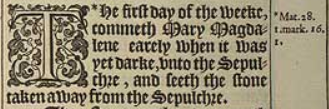 1 *The first day of the weeke, commeth Mary Magdalene earely when it was yet darke, vnto the Sepulchre, and seeth the stone taken away from the Sepulchre.[*Mat.28. 1. mark. 16.1.]