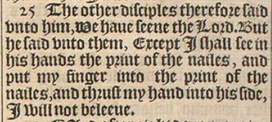25 The other disciples therefore said vnto him, We haue seene the Lord. But he said vnto them, Except I shall see in his hands the print of the nailes, and put my finger into the print of the nailes, and thrust my hand into his side, I will not beleeue.