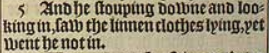 5 And he stouping downe and looking in, saw the linnen clothes lying, yet went he not in.