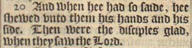 20 And when hee had so saide, hee shewed vnto them his hands and his side. Then were the disciples glad, when they saw the Lord.