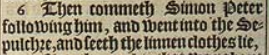 6 Then commeth Simon Peter following him, and went into the Sepulchre, and seeth the linnen clothes lie,