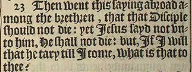 23 Then went this saying abroad among the brethren, that that Disciple should not die: yet Iesus sayd not vnto him, He shall not die: but, If I will that he tary till I come, what is that to thee?