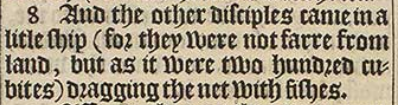 8 And the other disciples came in a litle ship (for they were not farre from land, but as it were two hundred cubites) dragging the net with fishes.