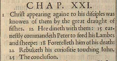 1 Christus, wieder seinen Jüngern erscheinend, wurde von ihnen erkannt durch den großen Fischzug. 12 Er isst mit ihnen: 15 Befiehlt Petrus ernsthaft, seine Lämmer und Schafe zu füttern: 18 Sagt ihm seinen Tod voraus: 22 Tadelt seine Neugier über Johannes. 25 Das Fazit.