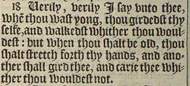 18 Uerily, verily I say vnto thee, whē thou wast yong, thou girdedst thy selfe, and walkedst whither thou wouldest: but when thou shalt be old, thou shalt stretch forth thy hands, and another shall gird thee, and carie thee whither thou wouldest not.