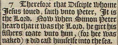 7 Therefore that Disciple whome Iesus loued, saith vnto Peter, It is the Lord. Now when Simon Peter heard that it was the Lord, he girt his fishers coate vnto him, (for hee was naked) & did cast himselfe into the sea.