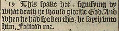 19 This spake hee, signifying by what death he should glorifie God. And when he had spoken this, he sayth vnto him, Follow me.