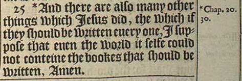 25 *And there are also many other things which Iesus did, the which if they should be written euery one, I suppose that euen the world it selfe could not conteine the bookes that should be written, Amen.[*Chap. 20.30.]