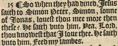15 ¶ So when they had dined, Iesus saith to Simon Peter, Simon, sonne of Ionas, louest thou mee more then these? He saith vnto him, Yea, Lord, thou knowest that I loue thee. He saith vnto him, Feed my lambes.