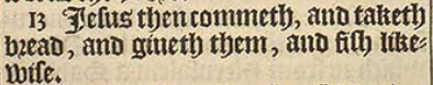 13 Iesus then commeth, and taketh bread, and giueth them, and fish likewise.