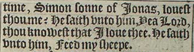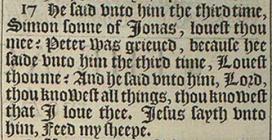 17 He said vnto him the third time, Simon sonne of Ionas, louest thou mee? Peter was grieued, because hee saide vnto him the third time, Louest thou me? And he said vnto him, Lord, thou knowest all things, thou knowest that I loue thee. Iesus sayth vnto him, Feed my sheepe.