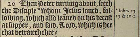 20 Then Peter turning about, seeth the Disciple *whom Iesus loued, following, which also leaned on his breast at supper, and said, Lord, which is hee that betraieth thee?[*Iohn. 13.23 & 20.2.]