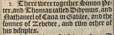 2 There were together Simon Peter, and Thomas called Didymus, and Nathaneel of Cana in Galilee, and the sonnes of Zebedee, and two other of his disciples.